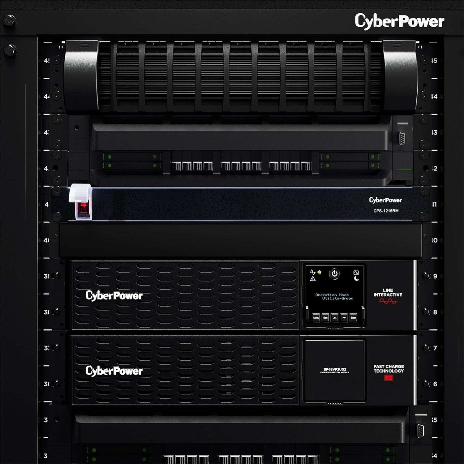 The CyberPower CPS1215RM, a 10-outlet (rear) rackmount power distribution unit (PDU), provides 100-125V 15A output. It distributes power to 10 NEMA 5-15R receptacles from a single NEMA 5-15P input with unfiltered electrical pass-through. Designed for datacenters and other electrically demanding applications, the CPS1215RM has durable metal housing and a 15-foot AC power cord. It can be mounted horizontally, includes a cord retention tray, and is UL Recognized. The CPS1215RM comes with a three-year limited warranty and covers defects in materials and workmanship in the product under normal use and conditions within three years of the purchase date.