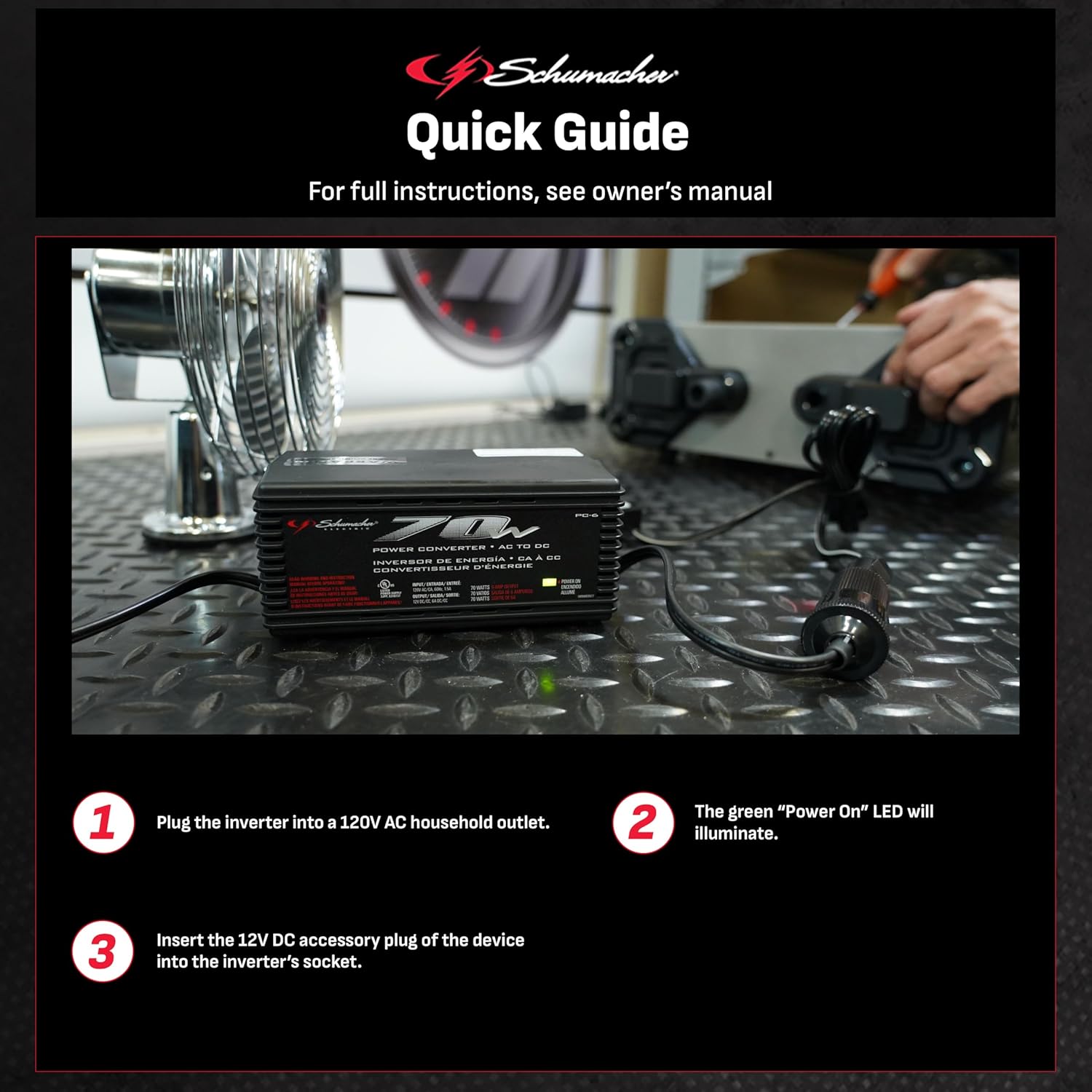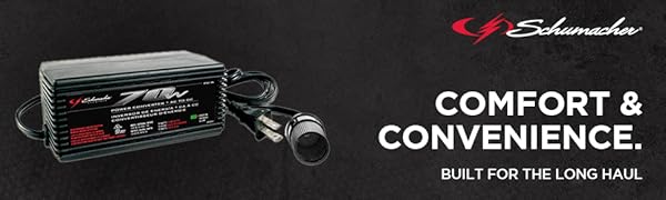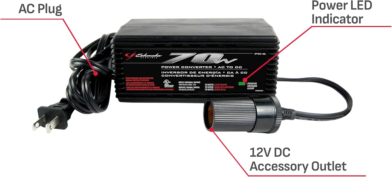 The Schumacher AC to DC Power Converter converts 70 watts continuous/140 peak watts AC to 12 Volt DC power, so you can use your 12 Volt products with AC anywhere — at home, at the office, or in hotels. Schumacher's 12 Volt products provide the comforts and convenience required by the professional drivers and travelers of today. Includes a simplified, easy-to-use design with an on/off switch, LED indicator light, and built-in plug and port.