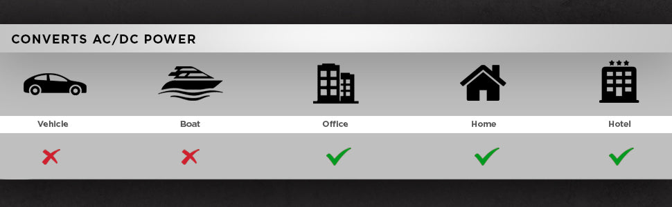 Converts 110-120V AC TO 12V DC, allows you to use 12V products at home, office or hotels