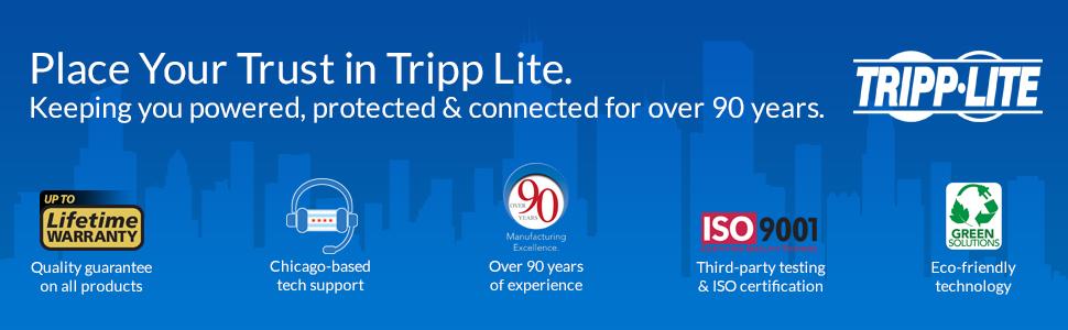 Founded in 1922 in Chicago, Illinois, Tripp Lite is a leading manufacturer of products to power, protect, manage, house, cool, connect and mount your equipment. From the largest data center to the smallest home office, Tripp Lite products keep your equipment running effectively and efficiently. Whether you need to supply power to servers and have reliable battery backup, connect high-resolution video sources to displays and digital signs, or organize and secure IT equipment in rack enclosure cabinets, Tripp Lite has the complete solution. Plus, before and after your purchase, our Chicago-based, in-house technical support specialists are available to assist you by phone, email and live chat. With over 95 years of quality products and service, Tripp Lite is a brand you can trust.
