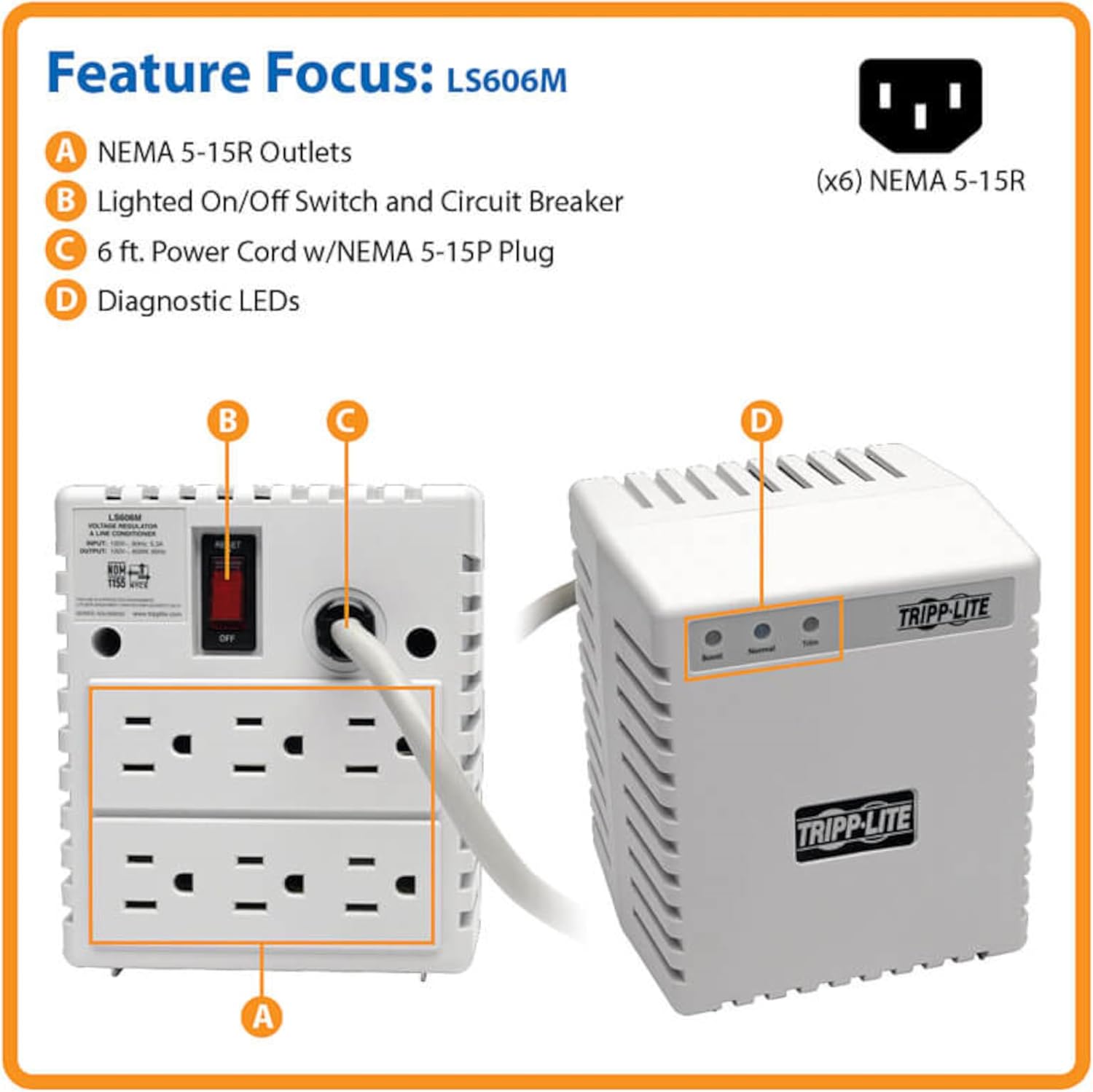 Plug your PC, laser printer, scanner, router, modem, television, stereo receiver and other home/office electronics into six NEMA 5-15R AC outlets to protect them against dangerous surges, spikes and line noise. The LS606M maintains nominal 120V power, which helps prevent lights from dimming or appliances from shutting down during use due to changes in voltage.