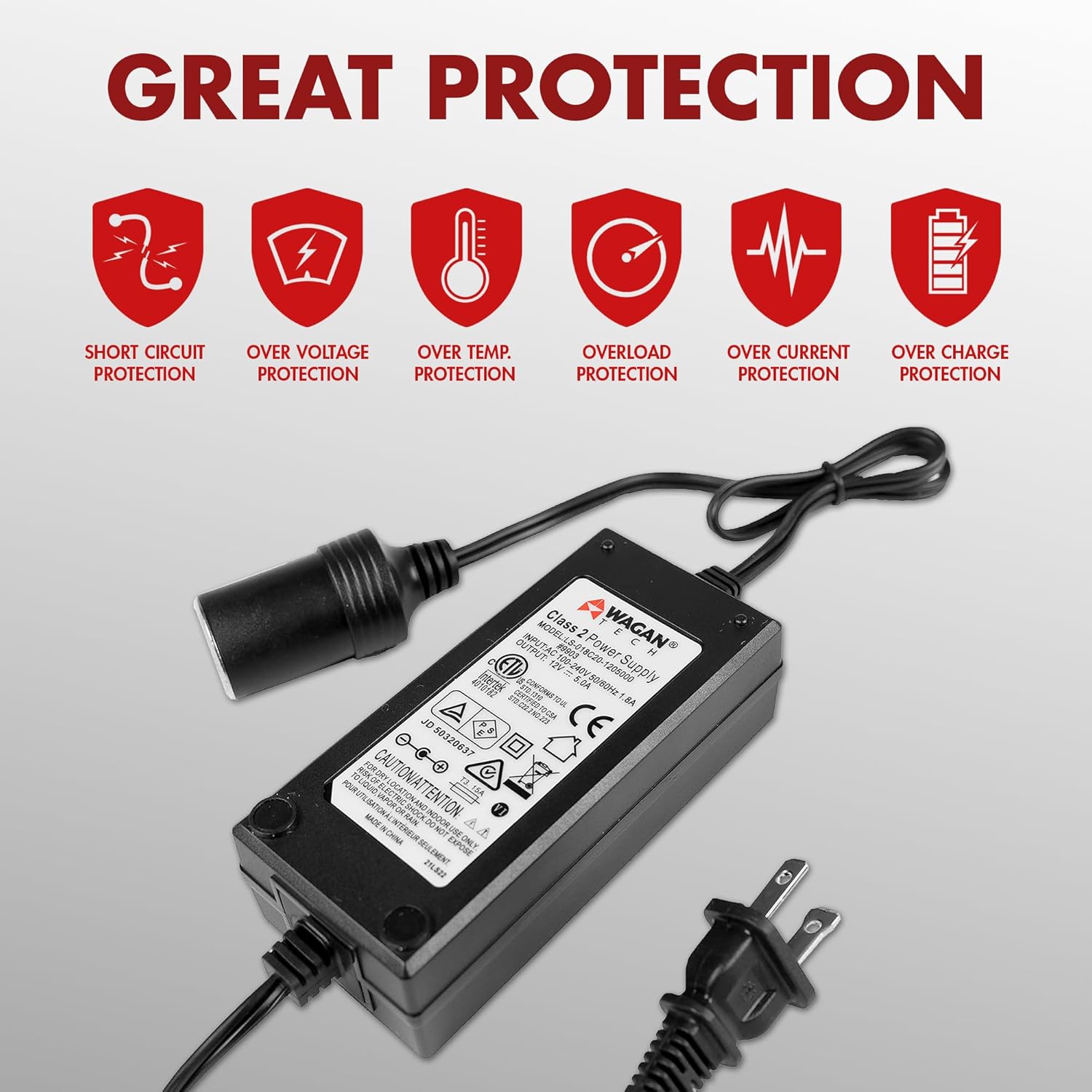 Wagan Tech’s AC to DC Power Adapter allows you to take your automotive (DC accessory socket) accessories with you wherever you go; converting wall outlet power (110-120V AC) to cigarette lighter socket (12V DC) power.
