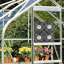A compact, efficient fan designed to circulate cool air within the greenhouse, maintaining a refreshing breeze and optimal temperature for plant growth. Its gentle hum blends with the rustling leaves, creating a soothing ambiance.